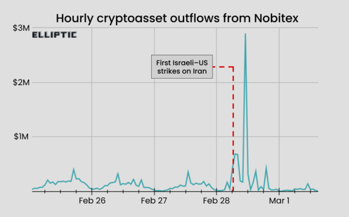 Sau vài phút từ vụ không kích, lưu lượng chuyển ra của tài sản điện tử trên sàn giao dịch tiền điện tử lớn nhất của Iran, Nobitex, đã tăn...
